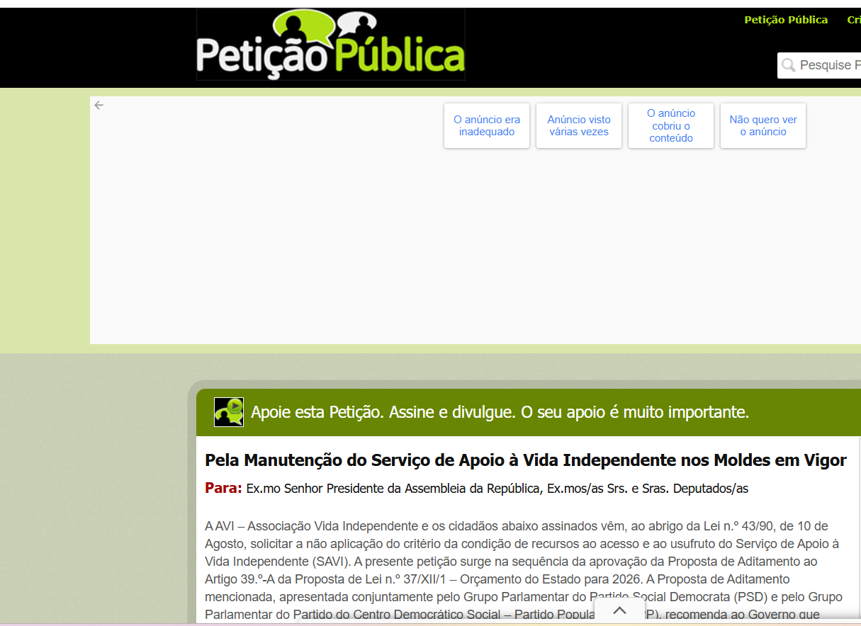 A AVI – Associação Vida Independente e os cidadãos abaixo assinados vêm, ao abrigo da Lei n.º 43/90, de 10 de Agosto, solicitar a não aplicação do critério da condição de recursos ao acesso e ao usufruto do Serviço de Apoio à Vida Independente (SAVI). A presente petição surge na sequência da aprovação da Proposta de Aditamento ao Artigo 39.º-A da Proposta de Lei n.º 37/XII/1 – Orçamento do Estado para 2026. A Proposta de Aditamento mencionada, apresentada conjuntamente pelo Grupo Parlamentar do Partido Social Democrata (PSD) e pelo Grupo Parlamentar do Partido do Centro Democrático Social – Partido Popular (CDS-PP), recomenda ao Governo que avalie a sustentabilidade do SAVI e pondere a aplicação do critério da condição de recursos à atribuição deste apoio social.